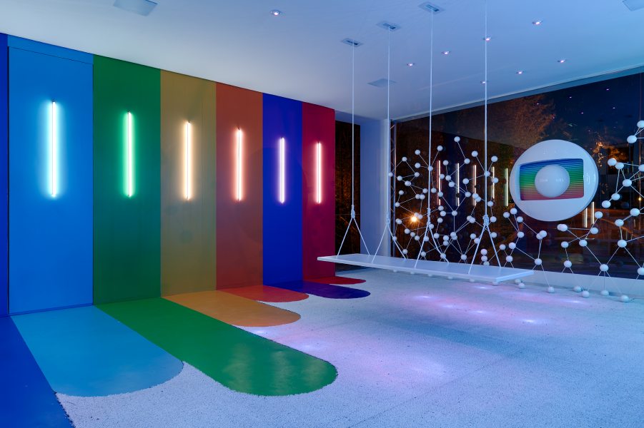 O espaço é cênico e, aqui, luz e som são protagonistas. E andam juntos: a trilha sonora criada exclusivamente para o ambiente interage com a luz, proporcionando várias propostas de intensidades e cores variadas. Para que essa ideia se tornasse eficiente, o ambiente foi todo projetado no branco, criando uma tridimensionalidade com a disposição de bolas de isopor que interagem com a marca da emissora. O revestimento em grama sintética do piso oferece sensação sinestésica e o espelho com recortes tridimensionais amplia o leque de sensações. Um amplo pano de vidro de 6m de largura e 3m de altura faz a integração com a área externa.