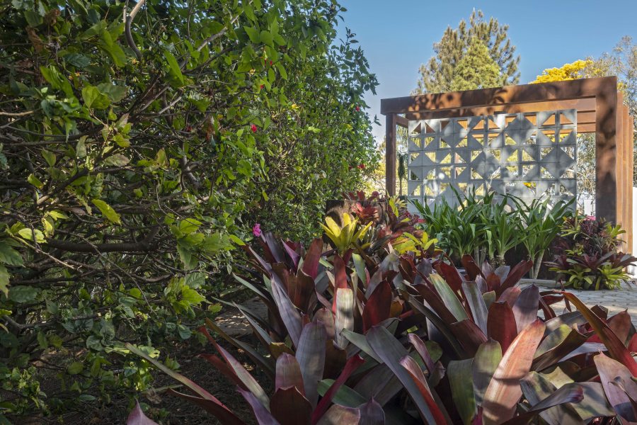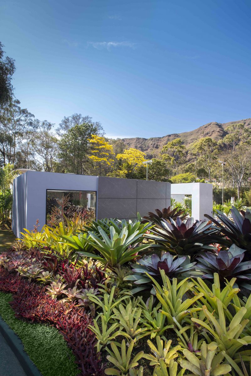 Com a piscina de forma ameboide ao lado e a Serra do Curral ao fundo é fácil entender o nome que lhe foi atribuído. Seu desenho curvilíneo reverencia também a característica do trabalho de Oscar Niemeyer, enquanto as formas e texturas exaltam, mais uma vez, a obra de Burle Marx. Nesse jardim, há uma jabuticabeira onde é possível sentar embaixo dela e uma bananeira ornamental, pontuada por muitas bromélias porto seguro. Chama a atenção os tons de amarelo e roxo que delineiam as curvas e fazem um movimento que segue o formato da piscina. Entre volumes baixos e altos, uma mancha com forração de Asa de Barata (Hemigraphis) finaliza com o movimento permitido pela altura das Dianelas. Na sequência, maciços de bromélias porto seguro e neoreglelias vão contornando e ladeando o caminho.