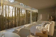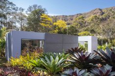 Com conceito intimamente ligado à sustentabilidade, a proposta aqui é descomplicar. Desde o sistema construtivo em estrutura metálica, que permite uma obra mais limpa, praticamente sem resíduos, proporcionando grandes vãos que integram os ambientes com mais fluidez, até a opção por um fechamento frontal em panos de vidro, permitindo uma utilização mais abrangente da iluminação natural e maior ventilação. Concreto, madeira e mármore somados aos tijolos de vidro conferem leveza e amplitude, sem abrir mão da sensação de refúgio, de lar. Materiais simples como a ardósia do banheiro ou a pedra sabão no piso do quarto do casal servem para mostrar que, com novas leituras. Com uma paleta de cores neutras que evidencia o branco, o projeto ganha ainda mais luminosidade. Unindo cozinha e estar, uma mesa em pedra natural dá ainda mais fluidez ao ambiente único. No quarto, a cama solta no ambiente inova o layout que tem banheiro integrado ao espaço e a majestosa presença da natureza com a presença de dois frondosos troncos das árvores de eucalipto: árvores nativas que permitem uma intimidade absoluta com a natureza em um ambiente tão reservado. Mimetizada ao terreno, a Casa do Lago sobrevoa o espelho d´água da fachada e o paisagismo à sua volta. Luxo puro e simples.
