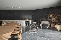 A proposta aqui é ultrapassar o conceito de cozinha e ser um laboratório de experiências, sejam elas sensoriais ou espaciais. A fachada principal, um grande vão aberto, convida a entrar. As demais são fachadas cegas, que não revelam o que acontece ali dentro. Ainda na área externa, o mobiliário é constituído de poltronas e mesas em chapa de metal e mármore. Mas mais inusitada ainda, a chegada é pelos fundos, através de um grande corredor revestido em concreto branco. O espaço propõe várias maneiras de uso e ocupação. Aulas de culinária, jantares inusitados, palestras, reuniões ao ar livre estão no cardápio e, para fugir completamente do padrão, foram utilizados materiais e elementos inovadores, com o poder de transportar os usuários a algum lugar fora do comum. Até o design do mobiliário foge do usual, com pufes e cadeiras revestidos em feltro cinza. Entre os materiais presentes, além do feltro, o aço, a pedra sabão e o ônix que está no balcão, com torneiras escondidas e apelo hightech. A tela iluminada ao fundo é mesmo destinada a causar sensações. Quando se entra no ambiente, é este painel que puxa todos os olhares logo de cara. Sintonizado com toda a proposta, o sistema construtivo escolhido foi o Steel Frame, que pode ser facilmente transportado para outros terrenos.