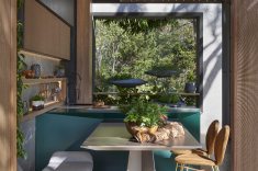 Nem parece um container, mas é. Tudo por causa do revestimento externo, um lambri de pinus, pintado em dois tons de verde, que dá um ar de casinha rústica a um ambiente em que até o tempo parece ser menos eletrônico e mais artesanal. O deck em madeira é uma extensão do espaço interno e tem um charmoso pergolado em fibra de coco natural criando um divertido jogo de luz e sombra. Internamente, além de um pequeno e confortável estar, chama a atenção a simplicidade das cadeiras de serralheria artesanal com estofado em tecidos de diversas padronagens. Elas dão um toque de ternura à mesa de madeira maciça que serve como bancada para aulas ou reuniões, com desenho bem ao estilo de oficina, em linhas retas e robustas. Revestidas em tecido, as paredes reforçam o abraço que se sente ao entrar nesse ateliê, pensado para a realização de cursos coletivos de artes manuais como cartonagem, cerâmica, costura e bordado.