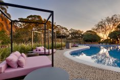 O bar de drinks à beira da piscina foi inspirado nos rooftops novaiorquinos. A madeira do deck, de seis centímetros de espessura, com desenho cartesiano, chama atenção pela técnica japonesa de queima Shou Sugi Ban, que ao carbonizá-la, cria uma casca resistente ao tempo. Em contraponto, a estrutura de aço da cobertura segue a organicidade da piscina. O bar, todo em madeira natural tem balcão em pedra Perla Santana retroiluminada e, sobre ele, pendem luminárias latão natural escovado que ganharam pintura dourada em estilo art déco. Multifuncional, o mobiliário é colorido, leve e fácil de transportar. Pufes são usados como mesa e como pufes mesmo. Outras mesas de formatos variados, quadradas, redondas ou ovais seguem a onda de bom humor, com destaque para a mesa com tampo de vidro de Zanini de Zanine. Na composição descontraída, cadeiras, lounge chairs e espreguiçadeiras dão ritmo ao cenário. Há ainda drinkerias na beira na piscina, montadas em carrinhos de bar, típicos de clubs novaiorquinos e com um toque bem brasileiro de material e de uso. Uma proposta ambígua de uso faz com que, de dia, a protagonista seja a piscina e, à noite, com o glamour das luzes acesas, ceda lugar para o bar.