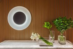 Passar por aqui é como se permitir um respiro entre um ambiente e outro. Disposto em duas etapas, a primeira parte tem corredor com paredes brancas e boisseries e uma grande tela que ora anuncia, ora suaviza a expectativa do visitante, que se depara com um espelho que reflete a perspectiva da etapa seguinte e destaca a imensa obra ao fundo, em preto e branco, de Rodrigo Tonani, em acrílica e carvão sobre tela, trazendo uma ideia de movimento. Na sequência, mais paredes brancas com boisseries, de um lado, onde está a tela toda branca em massa acrílica e esmalte sobre tela, também de Rodrigo Tonani e, na extensão do lado oposto e do teto, um painel ripado no dourado faz link com o guarda-corpo original da casa. É nele que se localiza a bancada de mármore branco cintilante toda iluminada e a arandela que dá movimento ao espaço, quebrando a rigidez das linhas retas da bancada.