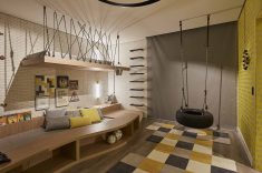 Uma criativa cama suspensa usa cordas como guarda corpo e também para uma possível descida em rapel. Para subir, o acesso pode se valer da parede de escalada ou ainda a escada de marinheiro. Aqui é o descanso do “guerreiro mirim”, que tem fácil alcance a um espaço de relaxamento, logo abaixo, de onde pode assistir TV ou jogar videogame, e a área de descompressão, um nostálgico balanço de pneu. O painel preto que sai detrás da TV e também está presente na área de estudo junto ao closet, pode ser usado para extravasar a criatividade com desenhos ou escritos do usuário. Ele está conjugado à bancada e prateleiras iluminadas, com fundo em papel camurça, além da cadeira com pegada high tech, da Beatriz Maranhão. A descontração geral é reforçada pelo papel de parede predominante no espaço do quarto, com fundo amarelo e estampa de letras grafite em paleta que inclui o cinza e o preto. No banheiro, o conforto da madeira no teto, parede e bancada aproxima o jardim vertical, dentro do conceito de biofilia. Destaque aí para o inusitado pendente com seis tubos amarelos.