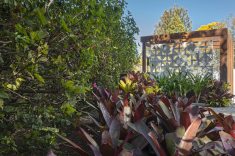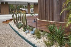 O conceito de carência permitiu que o diferente aflorasse com características de regiões semiáridas e desérticas. Assim, sobre a forração de areia, a composição das plantas busca reproduzir o mais próximo do que se vê na natureza: não há uma forma pré-estabelecida. Os agrupamentos se diluem aos poucos, como se a ação dos ventos, dos pássaros e de outros agentes polinizadores tivessem contribuído nessa composição. Com uma paleta de cores bem variada, cactus, aloe vera, aloe arbórea, suculentas (echevirias) e agaves fazem a festa. As xerófitas só não estão no espaço que fica sob uma amendoeira porque ali não há sol. Por isso, a opção para esse pedaço de jardim foi lançar mão de outras espécies, típicas da restiga, como é o caso do bromélis bilbergias, gênero da Mata Atlântica próxima ao litoral.