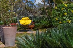 Bromélias, dracenas e filodendros, também alinhados ao conceito de Burle Marx, acompanham as duas jabuticabeiras e o imbé majestoso, já presentes no terreno. O verde circula o ambiente do bar, que tem área central livre. Aqui, o conceito paisagístico é mais limpo, com menos espécies e maciços em determinados cantinhos que utilizam, por exemplo, a dracena borboleta. Uma bordadura no entorno da piscina foi feita com fórmios verdes, cujas folhas em formato de lâmina têm grande apelo ornamental. A tropicalidade é ainda reforçada pela presença da cores: o roxo das bromélias imperiais e o amarelo da espécie porto seguro.