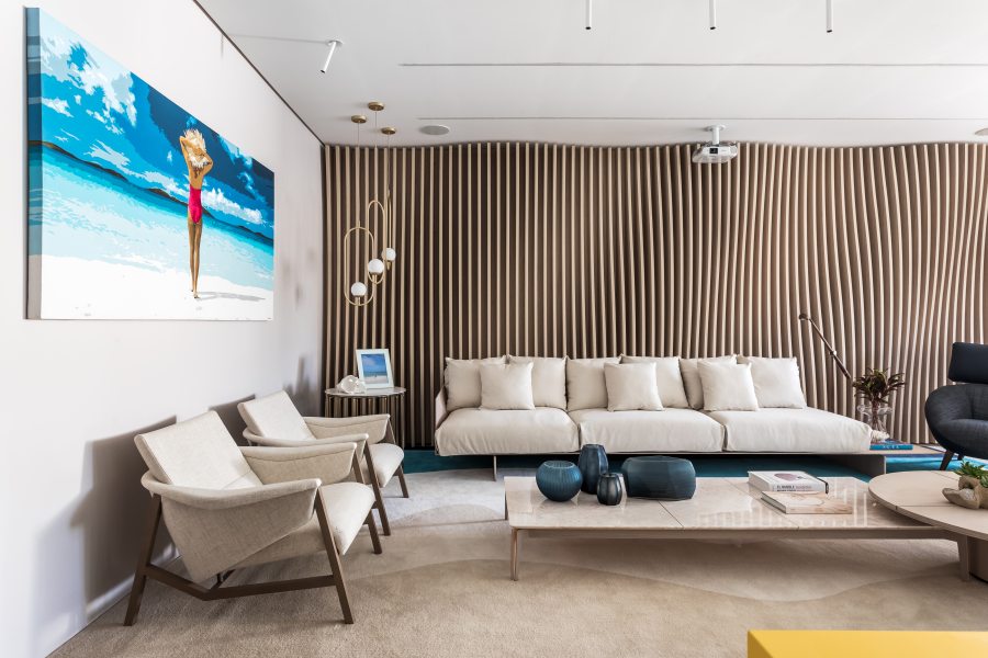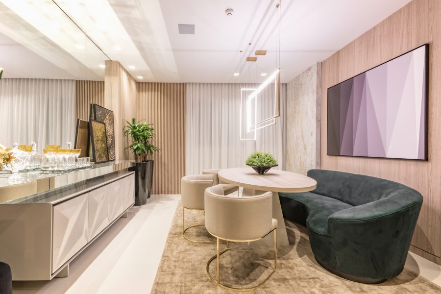 Reunindo tecnologia e sofisticação, o Home Theater foi inspirado na busca constante das novas gerações por um estilo de vida desacelerado. Com toques de mostarda e azul no mobiliário Saccaro Curitiba, o espaço apresenta alguns lançamentos da tradicional marca de móveis brasileira, como o Home Theater Noa, assinado pelo designer Luan Del Sávio, o Banco Fenda, de Guilherme Wentz e a Mesa Lateral Tríade, de Bruno Faucz. Destaque especial para o elegante sofá modular Sintra, do Estúdio Saccaro, perfeito para um ambiente de home. O ambiente é dividido na área do home e lounge, onde pode-se aproveitar momentos de descontração bebendo um whisky ou fumando um charuto. Na área do home, o efeito de cinema fica por conta do telão de 125” com projeção 4K, enquanto o mármore negro traz requinte ao ambiente. As caixas de som embutidas premiadas garantem áudio da melhor qualidade, sem interferir na estética do espaço. Já o sistema de automação de áudio e vídeo do Espaço Interativo, permite a criação de diferentes cenas e dimerização no ambiente, conferindo maior conforto e praticidade aos indivíduos.
