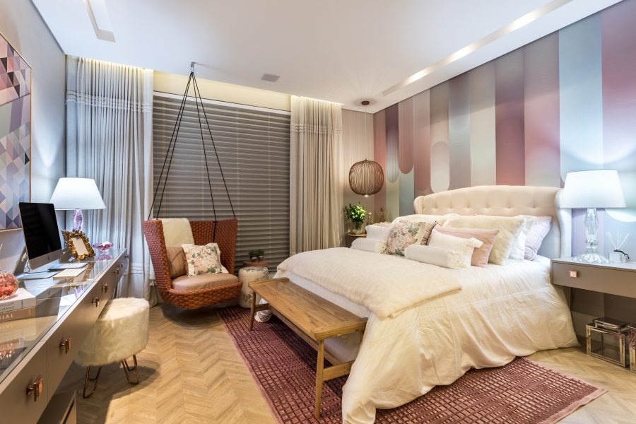 Com 36m², o espaço suíte da menina é uma homenagem à Maria Clara Buchi Giglio, de personalidade alegre, conectada às tendências, criativa, e repleta de amigos e de hobbies. O ambiente conta com um mix de elementos modernos e tradicionais, lançamentos em acabamentos e decoração, e obras de acervo pessoal. Cores neutras, tons de bege, rosé, e azul criam um espaço tranquilo e, ao mesmo tempo, alegre. O destaque vai para o painel estampado, atrás da cama da menina, sua estampa se repete nos azulejos confeccionados especialmente para o banheiro, que é separado por uma parede de vidro. A banheira Venetian, da Axell Spas de Banho, oferece aspecto único ao banheiro, além dos metais rosé gold da Deca que são especiais. Para completar, o balanço Capadócia da Saccaro, que remete à pureza da transição de menina a mulher.