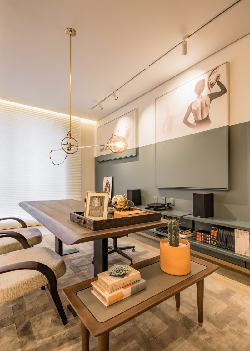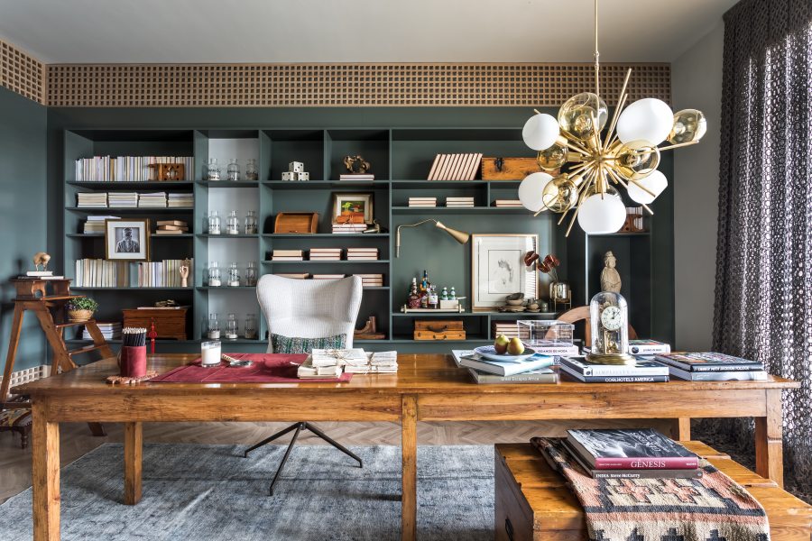 Um espaço de trabalho que busca o bem-estar, convívio e as lembranças. Essa foi a proposta da designer de interiores Flávia Mattar, para o ambiente de 36 m². Treliças de madeira clara compostas formam uma grande estante de livros, que compõe com o mobiliário solto do século XIX, do antiquário Arnaldo Danemberg, além de uma mistura de tapeçaria, couro e diferentes texturas. Uma das principais referências para o projeto foi a utilização de mobiliário restaurado, incentivando o uso de peças de família, com memória afetiva. Os matizes de verde, cru, ocre e berinjela somam a esse universo, trazendo poesia ao ambiente, que tem como referência o “Verde que te quero verde”, de Frederico Garcia Lorca.