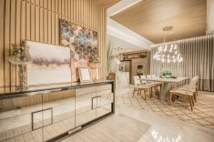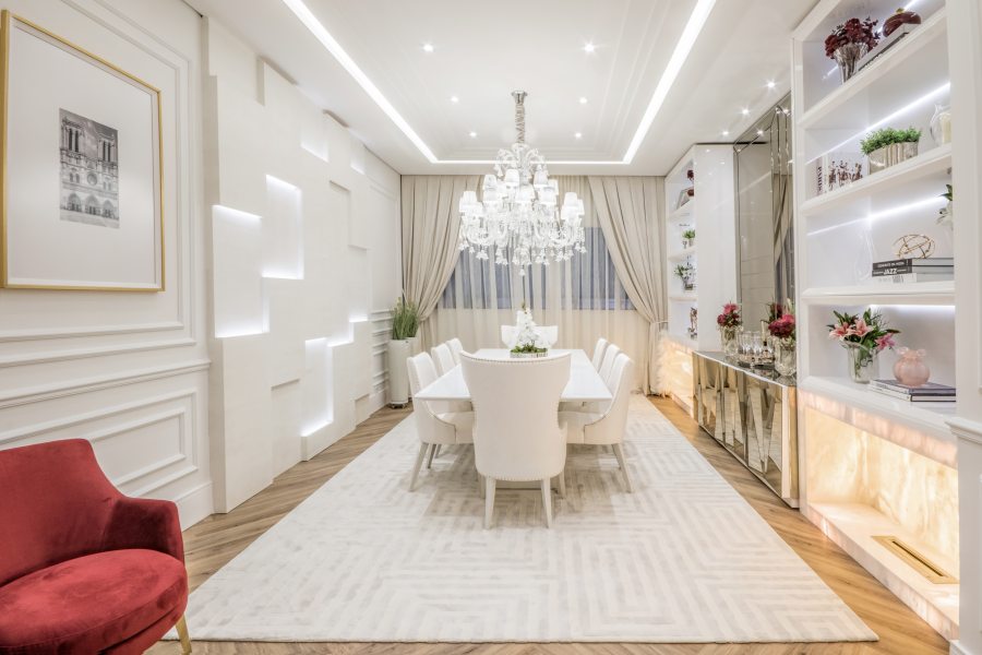 Em sua segunda participação, a designer de interiores Kátia Herzog traz o estilo parisiense para recriar a sala de jantar. Enquanto o off White remete ao clássico, a cor vinho e o piso em madeira aquecem o ambiente. O espaço de 32m² conta com móveis desenhados pela profissional, compostos com mobiliários soltos, que são revestidos por couro reciclado e tecido ecológico, antimanchas e repelente a líquidos. As peças foram escolhidas e projetadas para facilitar futuras manutenções. Destaque para o buffet e para o espelho 3D. A elegância da pedra translúcida e da adega climatizada arremata o projeto.