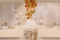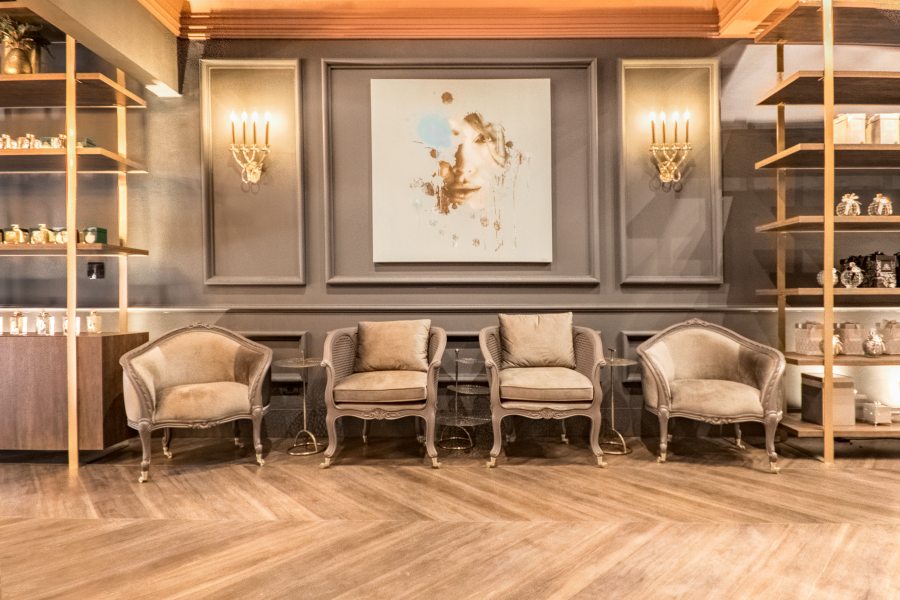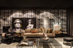 Marcando a 11ª participação de Walkiria Nossol na CASACOR Paraná, a decoradora assina a Galeria de Aromas da Mels Brushes. Com mescla de estilos industrial e neoclássico, o projeto ganhou ar intimista com iluminação aparente feita com spots sobrepostos à laje, que compõem com as arandelas da década de 1940. O destaque vai para o uso de grafismos em uma das paredes, tendência europeia que utiliza a reprodução dos tons das paredes nos objetos e móveis colocados à frente.