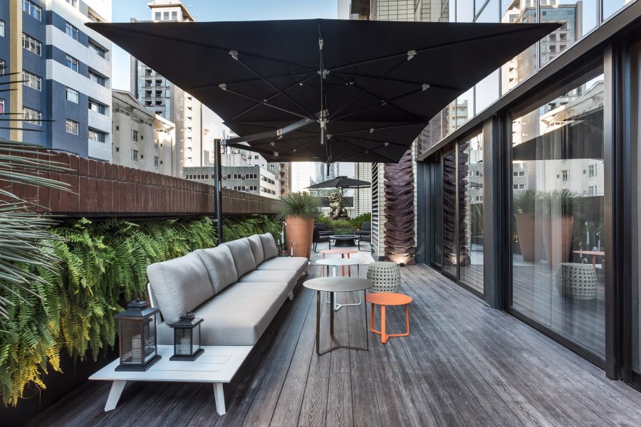 Complementando o bar e espumanteria, o Sky Garden convida os visitantes a saírem de suas zonas de conforto para conhecerem a área externa da mostra. Assinado pelos paisagistas Beto Lemos, Nadia Bentz e Vanderlan Farias,o ambiente tem a proposta de ser um jardim útil que estimula a interação com a natureza e o convívio social. Uma das peças que proporciona esse conforto é um ninho confeccionado em corda náutica, material tendência no décor. As vegetações altas, a parede verde e os vasos são funcionais e otimizam os 85m². A fachada deste ano da CASACOR Paraná, localizada no antigo Curitiba Outlet Center, é aparente para quem está dentro do prédio. Para harmonizar com a estrutura original, os profissionais priorizam uma paleta neutra que envolve preto e cinza, além dos tons terrosos. As cores aparecem em pontos de destaque objetos e pequenos móveis, composição que instiga os sentidos e torna o Sky Garden ainda mais interessante.