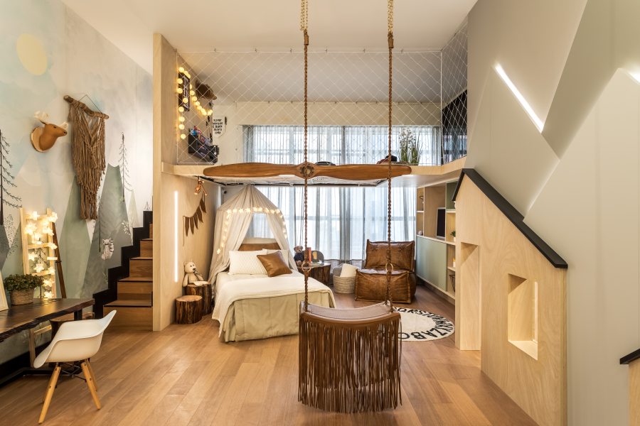 Com conceito escandinavo, o projeto realizado em homenagem ao jovem Pedro Henrique Muricy, filho da influenciadora digital Fabbi Cunha, conta com móveis de linhas simples e sóbrias no estilo minimalista e cores neutras. O destaque fica por conta da releitura da casa da árvore: o mezanino revestido de madeira natural, com rede no piso, localizado no piso superior, onde as crianças poderão explorar a imaginação com brincadeiras lúdicas, livros e filmes. Logo embaixo há uma casa pensada para os pequenos e outra para um cãozinho, além de balanço, quadro negro e mesinha de madeira para atividades. Cores neutras e pinceladas de verde claro compõem com a madeira, além do papel de parede pintado em aquarela. O ambiente foi totalmente automatizado: iluminação, áudio, sonorização, além câmeras de circuito interno, todas controladas por smartphone. A TV do piso térreo conta com sistema de elevação que, quando utilizado, eleva-se do armário. As madeiras naturais do ambiente foram reaproveitadas.