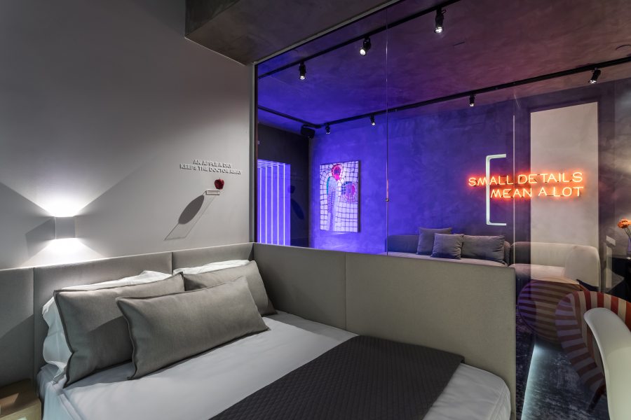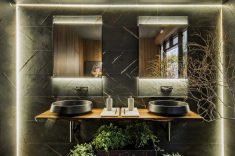 Luzes baixas e tons escuros deixam o ambiente descolado e cheio de personalidade. A ideia é que, em um primeiro momento, o usuário entre no ambiente e se depare com a sobriedade elegante do preto e linhas puras, mas ao entrar na cabine, uma explosão de cores do grafitti do artista urbano Michael Devis. As cubas imponentes com design assinado de Jader Almeida para Deca preenchem o espaço com harmonia e funcionalidade.