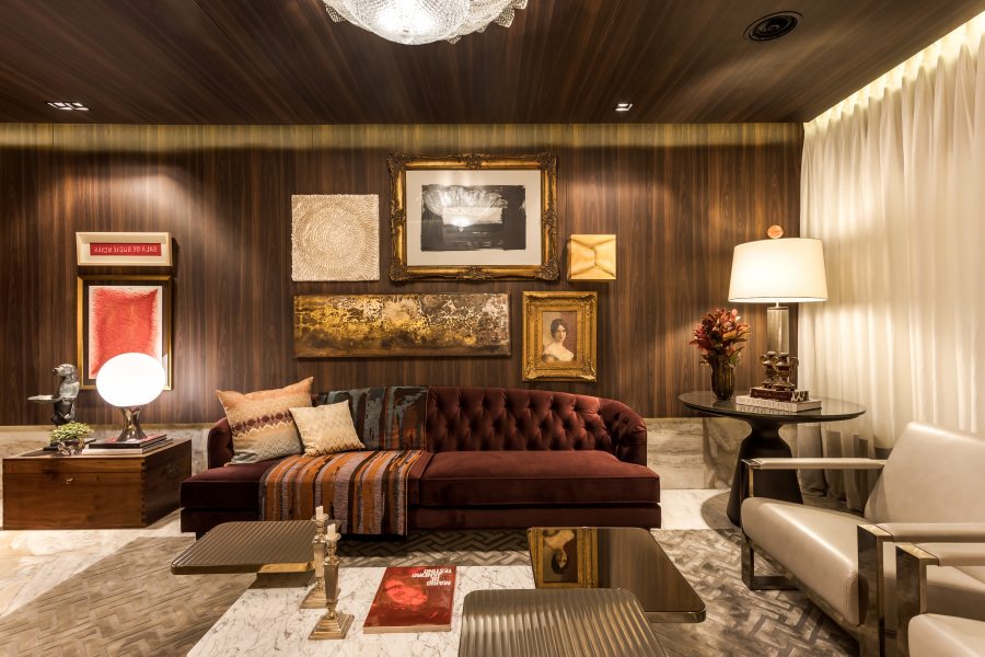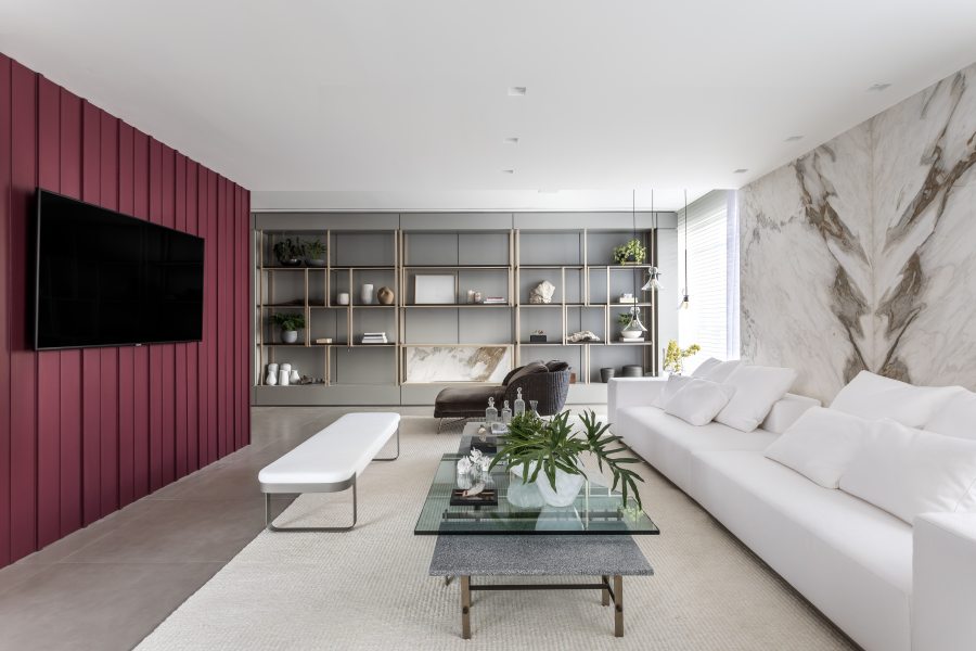 O ambiente projetado pela arquiteta Larissa Lóh é marcado pelo design nacional e o contraste de cores claras e escuras. O destaque fica por conta da cor ameixa e da mistura de materiais rústicos e nobres que revelam o conceito ecoluxury proposto. O balanço Ipê assinado pelo designer Sergio Matos revela-se como peça de valorização do ambiente, assim como os painéis em madeira natural Tauari e o painel ripado em tom Geleia de Ameixa da Tintas Coral. Painel em mármore Michelangelo atrás do sofá e a estante de ferro em MDF garantem sofisticação. O projeto também evidencia a identidade brasileira, utilizando materiais naturais e sustentáveis. A decoração é composta por mobiliário Artefacto e objetos de design nacional, com obras de artistas locais. Destaque para o granilite, presente em detalhes do mobiliário, que é produzido à base de resíduos de outros materiais.