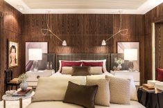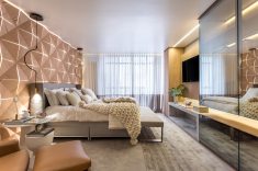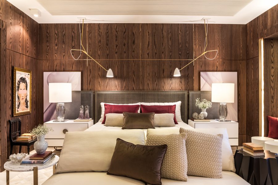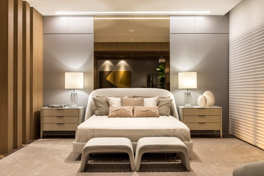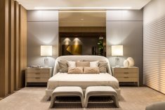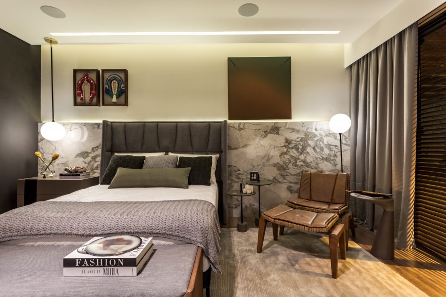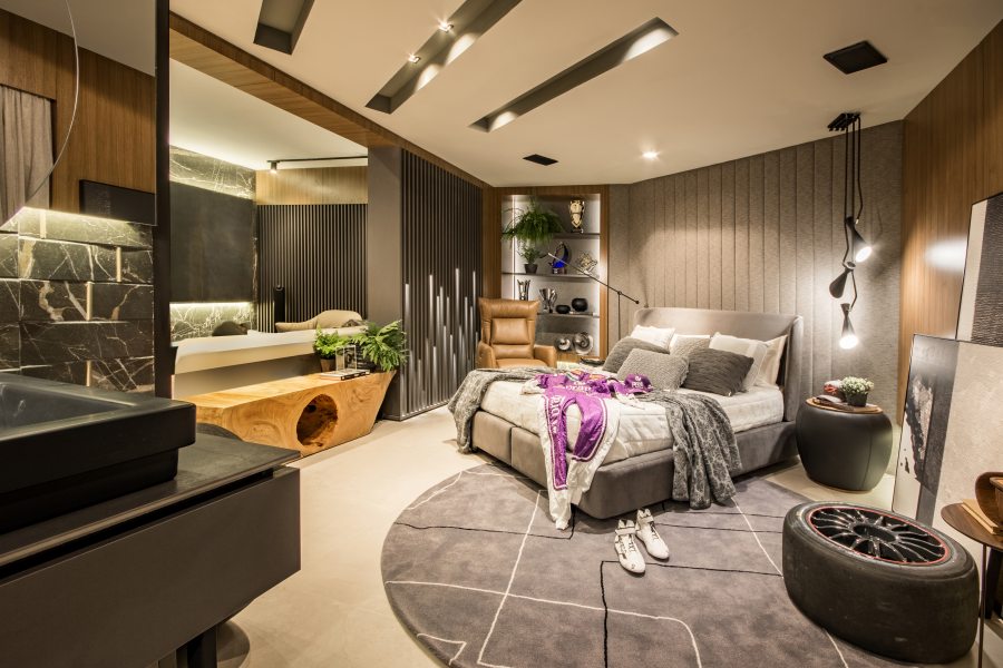 A suíte máster de 80m² foi projetada pelo arquiteto André Bertolucci e faz parte do Residencial Família Sênior. A suíte reúne detalhes modernos e diferentes texturas com mobiliário da Artefacto. Tons suaves de cinza claro, brancos e nudes, contrastam com tecidos dourados e painéis amadeirados de carvalho. O diferencial do projeto é a composição de um ambiente integrado, atemporal e moderno, com materiais nobres, resultando num espaço amplo, ideal para ser usado como home office, espaço para relaxar, cinema e claro, dormir. O projeto também é contemplado com um sistema de automação integrado, com tela de projeção e projetor de alta definição, módulos de controladores de luz, que criam cenários de iluminação e total controle de áudio, vídeo e persianas.
