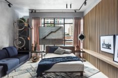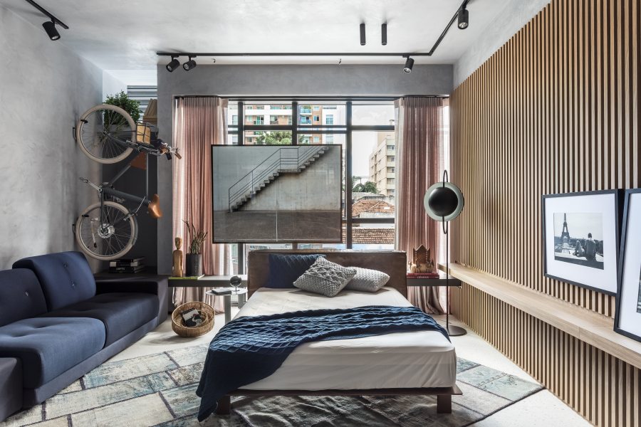 A arquiteta Carla Grudtner marca sua oitava participação na mostra assinando o Studio 33, um espaço de 36 m² pensado para o jovem fotógrafo Eduardo Macarios, especialista em fotografias de arquitetura de interiores e apaixonado por viagens. O ambiente é integrado e recebe luz natural através das grandes aberturas, em composição com as plantas naturais. A paleta de tons de cinza e azul contrasta com o colorido das obras de arte e das fotos feitas pelo homenageado. Destaque para a textura em cimento queimado, lançamento das Tintas Coral, do Silestone Calacatta Gold, porcelanato natural que lembra o granilite, e para o jardim de inverno do studio. O fotógrafo utiliza, como meio de transporte, uma bicicleta, que entra como parte da decoração.