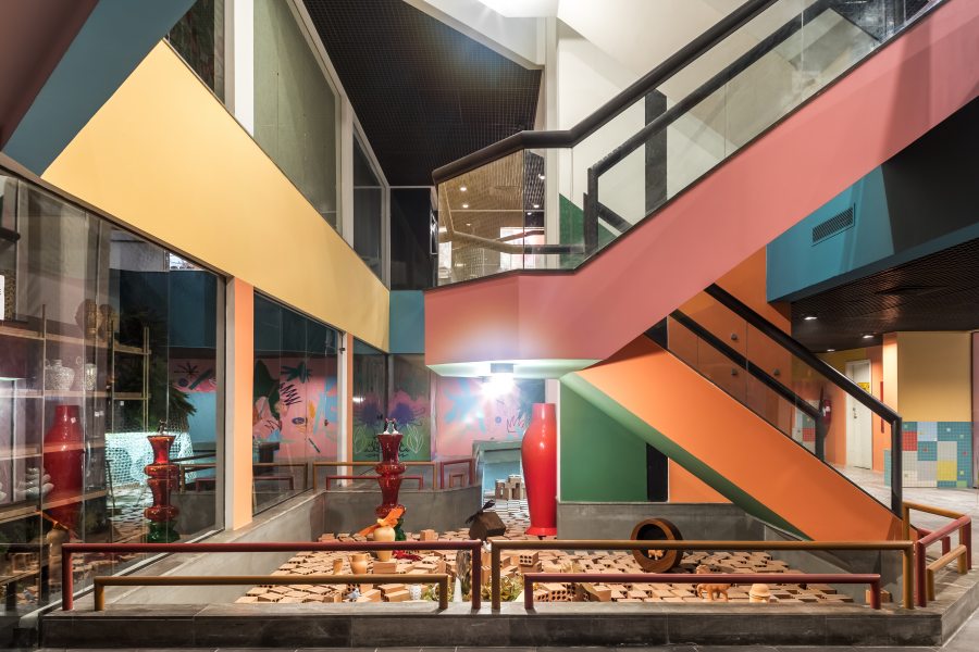 Inspirado na estética Kitsch, o designer de interiores João Miguel Santana aposta nos coloridos e elementos curiosos. Entre eles, os tijolos soltos, dispostos na área molhada do chafariz, plantas e peças de arte. O uso inusitado dos materiais, e das cores laranja, verde, vermelho, rosa, azul, amarelo e preto, combinado aos itens de arte e design, como a poltrona Flamboyant, assinada pelo estúdio do profissional, o eu lírico studio e pelo Pine AX Leather Goods arrematam o espaço. Pastilhas e azulejos são outros elementos que auxiliam a criar a desconstrução proposta pelo designer. Seguindo o tema “Planeta Casa”, João trouxe a afetividade por meio do uso de tijolos, que remetem a construções, moradias.