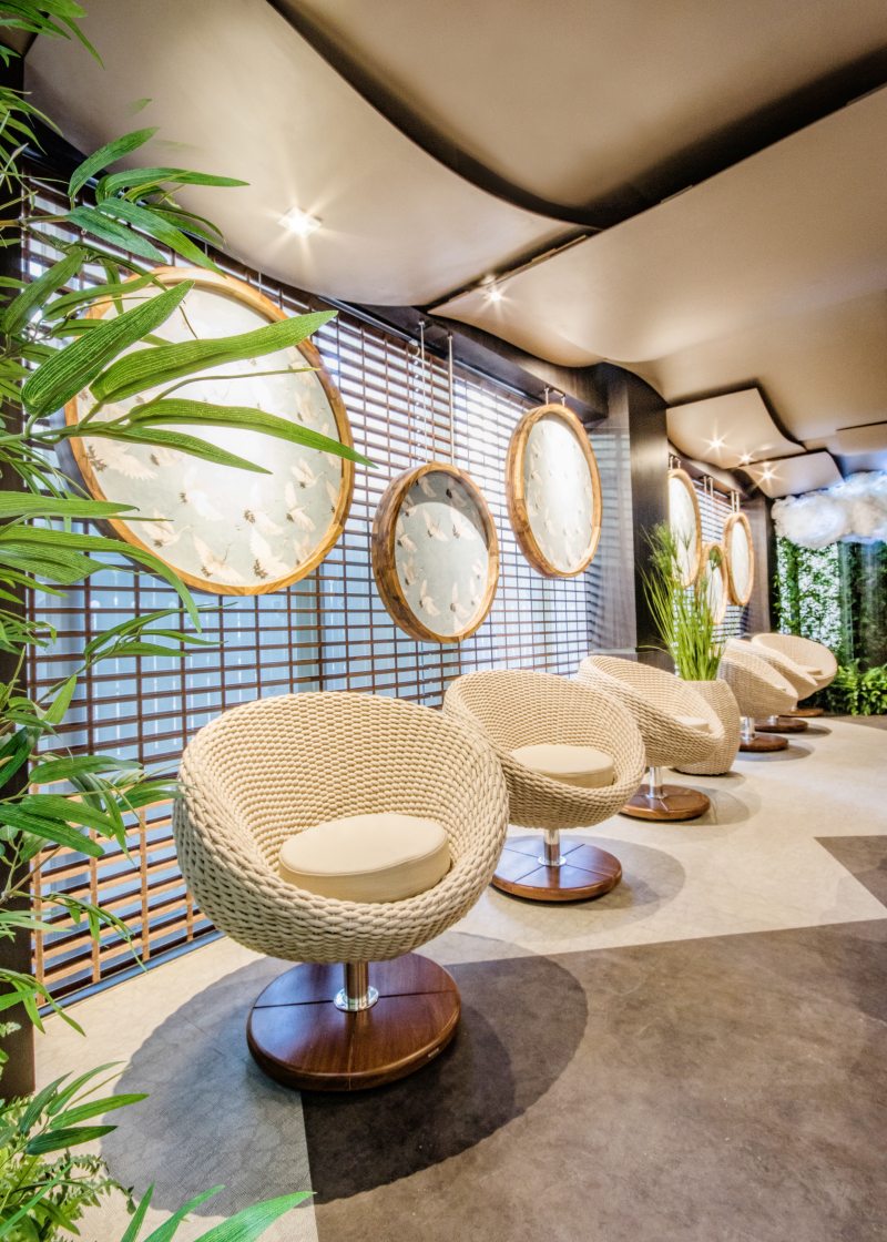 A arquiteta Daniela Cerbatto e o designer de interiores Rafael Cerbatto assinam o Lounge Rio Quente Resorts e Costa do Sauípe na CASACOR Paraná 2019. O projeto constrói uma atmosfera que remete ao pôr do sol dos resorts, lembrando a sensação de relaxamento nas férias. Cores vibrantes marcam os revestimentos da Portobello Shop, e tons neutros no mobiliário Green House. Elementos como água, areia e madeira são explorados nos acabamentos que replicam padrões naturais. Além das plantas, que formam uma verdadeira floresta urbana. Entre as exclusividades, as luminárias projetadas especialmente para o espaço, executadas pela Luna Luce. Os pendentes apresentam o formato orgânico de bolas e são produzidos com vidro leitoso, o acabamento gold reflete uma luz que remete aos raios de sol, criando um efeito degrade único na parede principal.