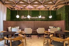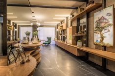 Em sua oitava participação, a arquiteta Viviane Tabalipa exalta a essência e as raízes brasileiras no projeto do Café Boutique, que além de se uma unidade operacional do Rause Café + Vinho, também funciona como um coworking. Inspirados nos clubes café de grandes cidades, ao ambiente conta com espaços acolhedores para degustação de cafés, vinhos e pratos. O toque da brasilidade fica por conta do papel de parede de folhas dos pendentes em corda.