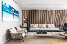 Pensado para um piloto de automobilismo, o ambiente foi projetado pela arquiteta Priscila Ruon e a decoradora Suely Ruon. Como os 78m² do loft são integrados, o espaço é totalmente funcional. As profissionais reuniram o que é essencial para uma residência proporcionar conforto e praticidade: living, espaço gourmet, quarto, closet e sala de banho. Ideal para o convívio entre amigos, a personalidade masculina do piloto também caracteriza o ambiente com a predominância de tons de cinza e texturas amadeiradas. O mobiliário automatizado é o ponto alto do projeto. O sofá Triunfo Natuzzi conta com a tecnologia CubicomfortTM Triple Motion que permite o ajuste independente, com efeito de inclinação que funciona para o encosto de cabeça, do assento e do apoio para pés. As peças da linha Flap, desenhadas exclusivamente pelo designer brasileiro Paulo Alves para a marca italiana se impõem no espaço. Para completar, mais um item de design assinado: a cadeira Asa de Rejane Carvalho Leite, cujo desenho fluído permite receber o usuário de forma aconchegante. Todos esses destaques do Loft do Piloto são exclusividades Ton Sur Ton.