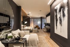 No espaço de 36m², o requinte e a sofisticação são apresentados de forma simples, nos pequenos detalhes, ao lado da praticidade. As obras de arte destacam-se no ambiente com paleta de cores que combina bege, cinza e branco. Pontos de destaque nas paredes ficam por conta do rosa e do papel de parede. A sofisticação ficou a cargo do elegante mobiliário da Artefacto e do exuberante projeto de iluminação. Pensando na sustentabilidade, foram dispostas lâmpadas de baixo consumo energético, revestimentos alternativos (como madeira de demolição e fibra natural) e marcenaria projetada visando menor consumo de materiais e energia elétrica.