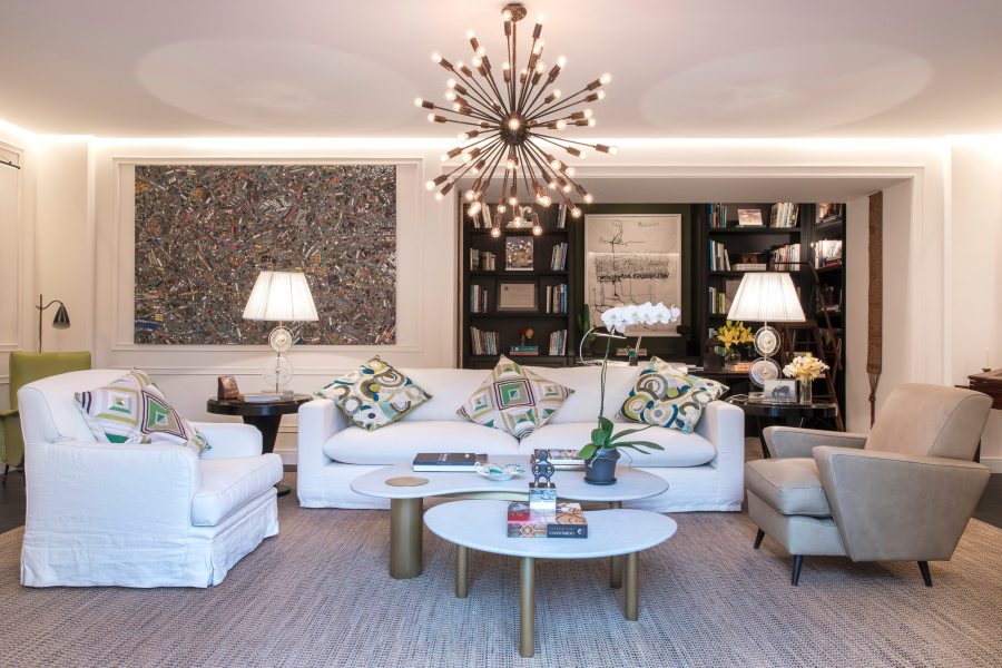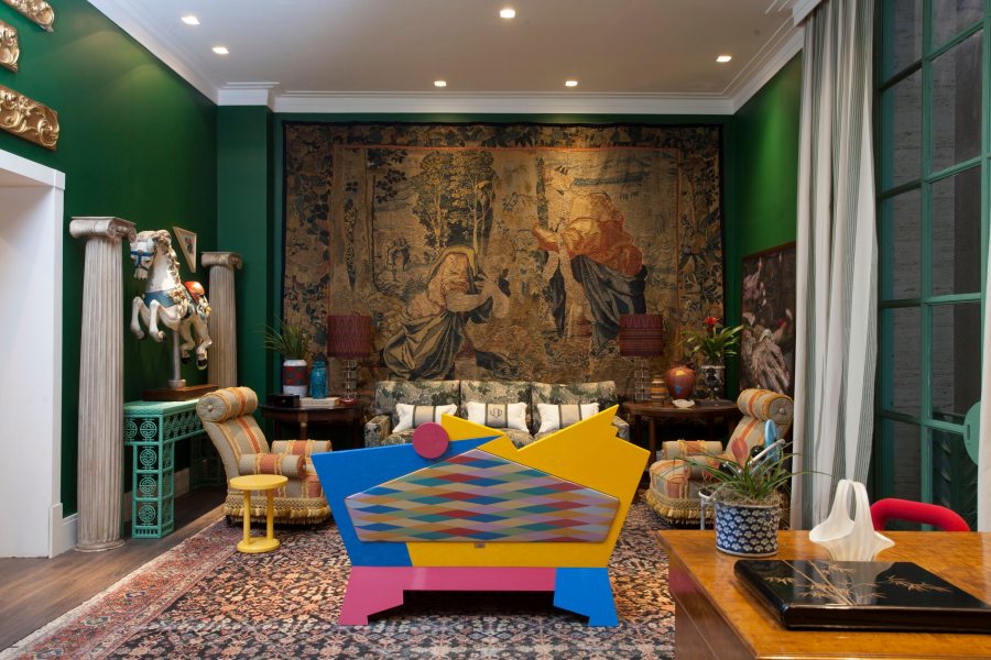 Nos 78 m² do ambiente que se divide em antessala e sala de estar, um manifesto à liberdade e à personalidade de cada um: aqui não há regras definidas, não há padrões ou tendências a seguir. “Quis mostrar que é possível misturar diversas referências, com peças e conceitos que considero importantes na minha trajetória profissional”, conta o designer de interiores. Por isso, no living, que é uma homenagem ao colecionador de arte, há itens de estilo art decô, biedermeier, Luís XV, peças indianas e da Escola Memphis, todos mesclados sem medo de ousar.