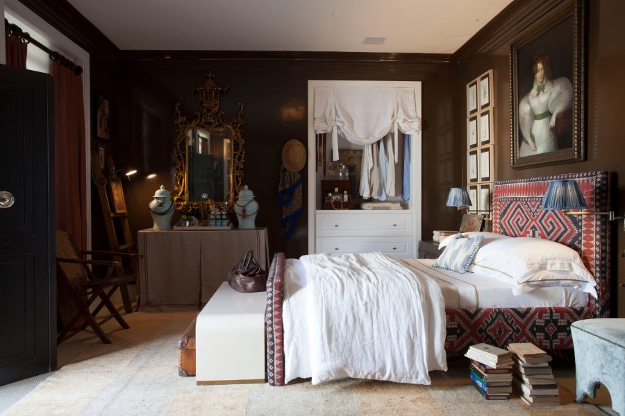 Intimista e masculino, o espaço assinado pelos arquitetos Paula Bignardi e Paulo Azevedo foi pensado para um escritor que busca suas inspirações em viagens pela Europa e pela Ásia. O quarto integrado a um escritório possui estantes com muitos livros e diversas obras de arte espalhadas em seus 28 m². A paleta de cores privilegia tons terrosos, dourados e vermelhos e diferentes texturas marcam presença em fibras naturais, madeira e diversos tipos de tecido.