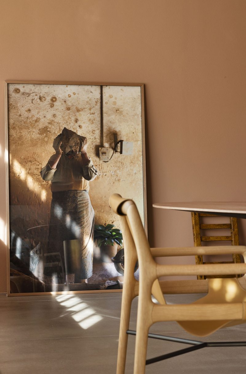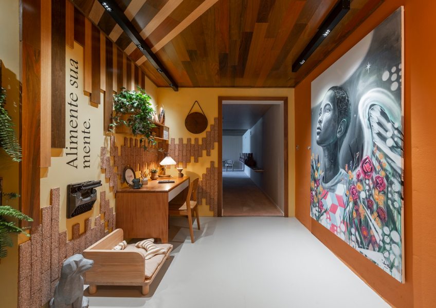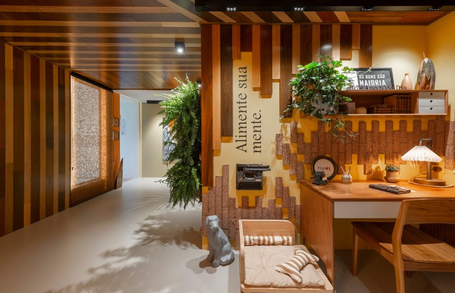 Aliás, neste projeto as cores aparecem não só nas paredes, mas também nos trabalhos dos artistas convidados. No primeiro andar os visitantes encontram a representação das mudanças e adaptações que ocorreram dentro da casa: um dos cantinhos, demarcado pelo tom terracota (cor: Extremo Sul), ganhou painéis que mesclam madeira ipê e tauri para criar o espaço dos hobbies. O ambiente destaca exemplos de habilidades e passatempos que aliviaram a mente e o coração durante o isolamento, como a música, o crochê e tricô, o origami e a leitura.