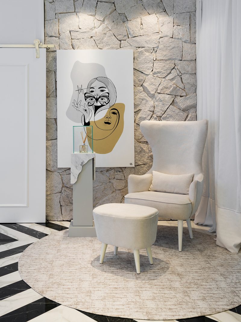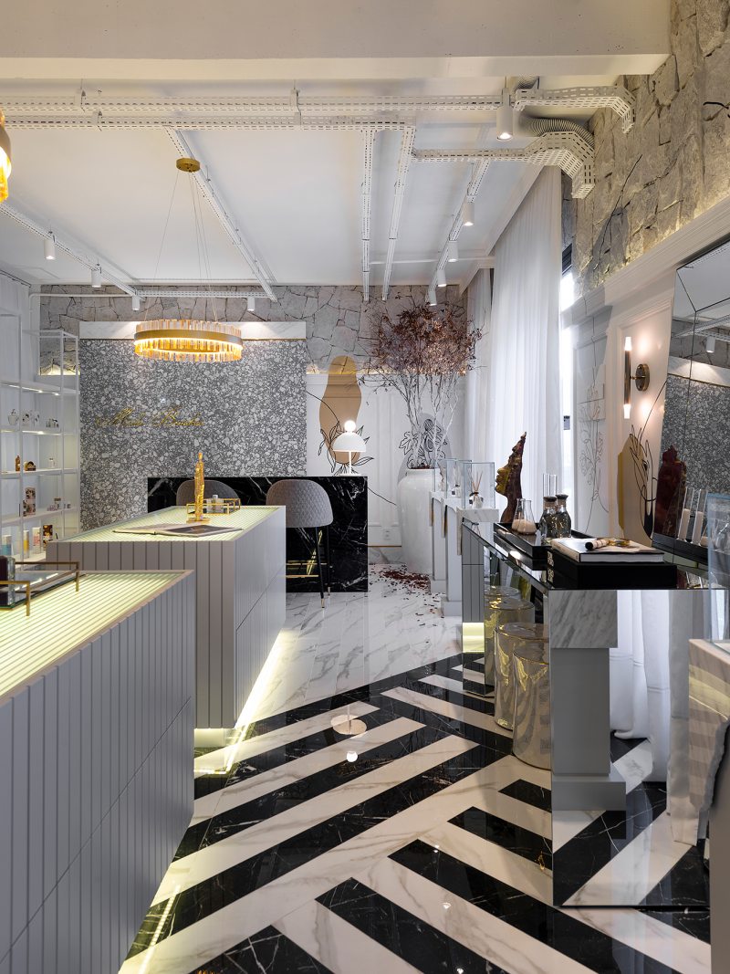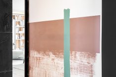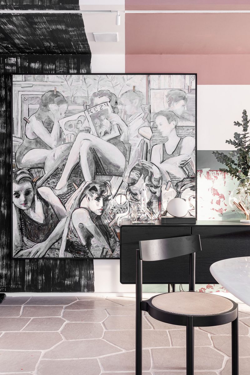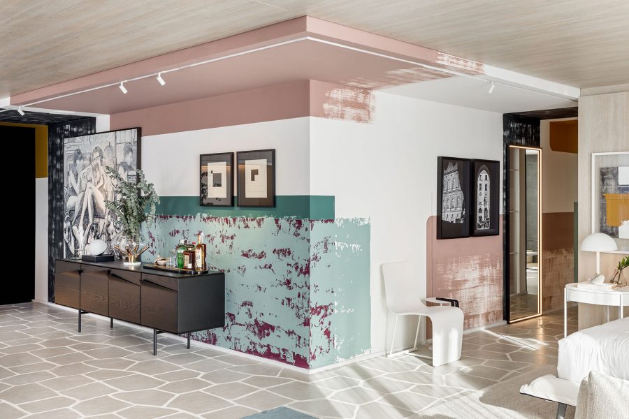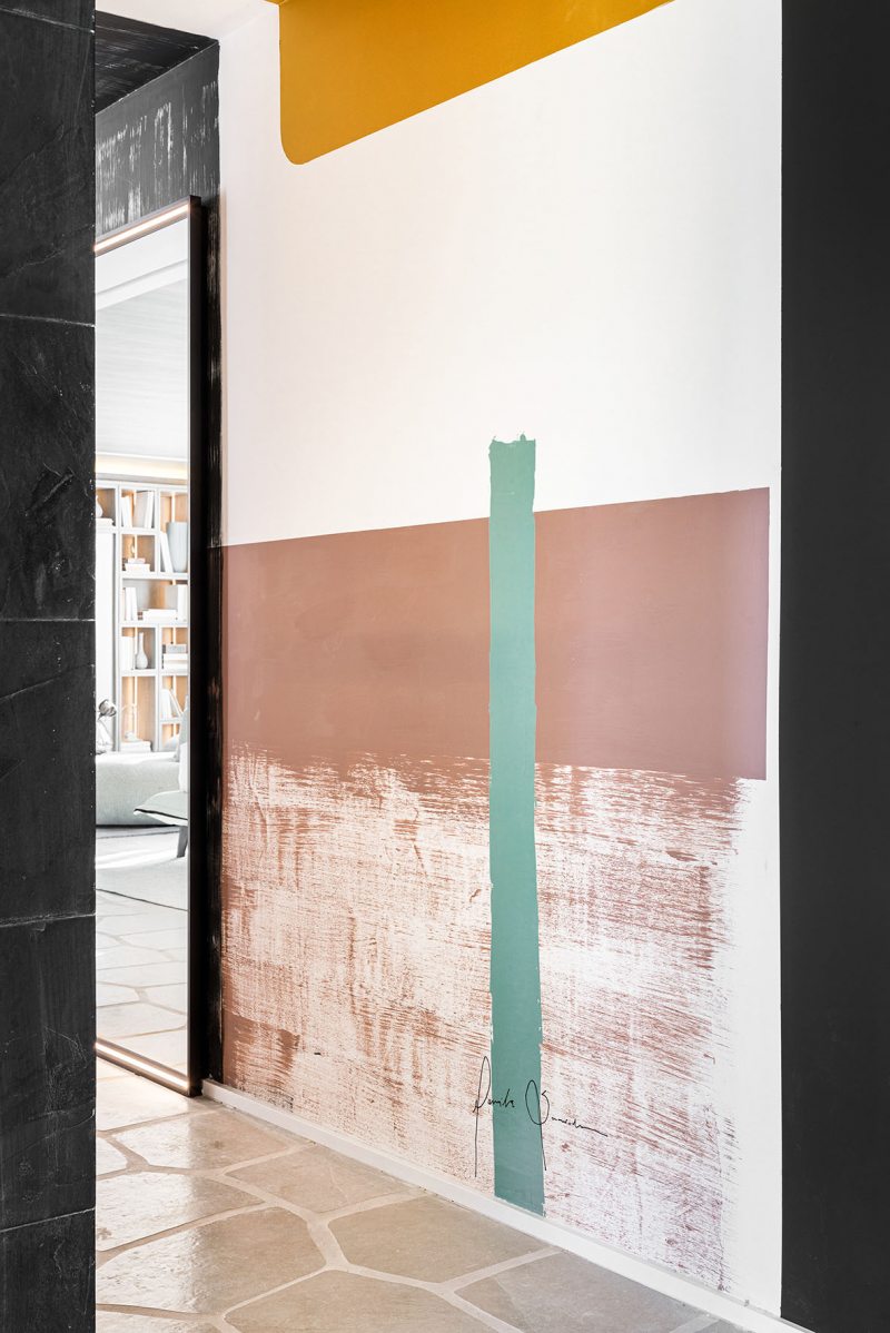 Os tons escolhidos evocam as cores outonais, com variações entre os verdes e os rosés. A pintura com elementos geométricos transborda para o teto as cores Trilha Verde, Tradição, Jardim Misterioso, Mostarda em Grão e Vinho do Porto. Branco e Preto, em tinta acrílica, vão do puro ao espatulado, com sobreposições e efeitos diferentes executados pela própria artista.