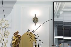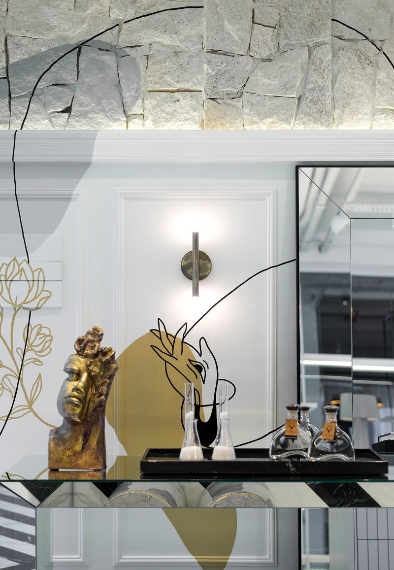 Os desenhos de magnólia, alecrim, figo e tangerina, pintados na parede, fazem conexão direta com o espaço e materializam algumas das essências usadas para a produção dos aromas. As artes que humanizam a Casa de Aromas foram desenhadas em preto. As cores Arroz Dourado e Prata Fina, que dão continuidade ao tons que já aparecem em outros itens do décor, arrematam com elegância as pinturas.
