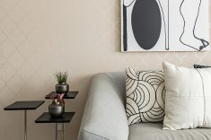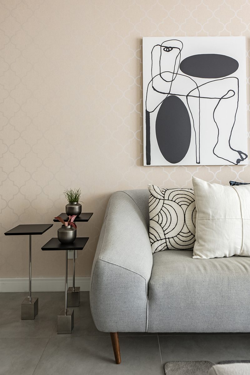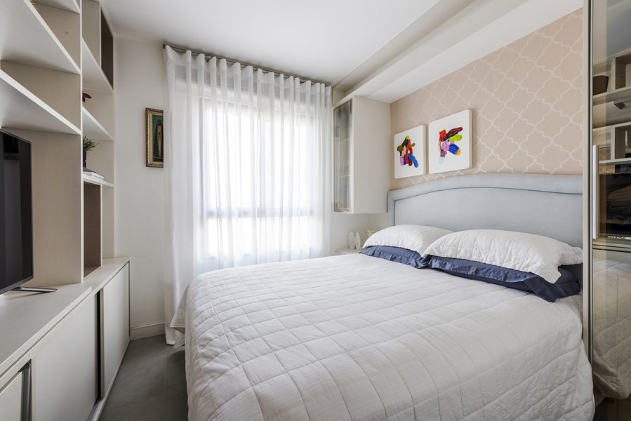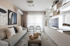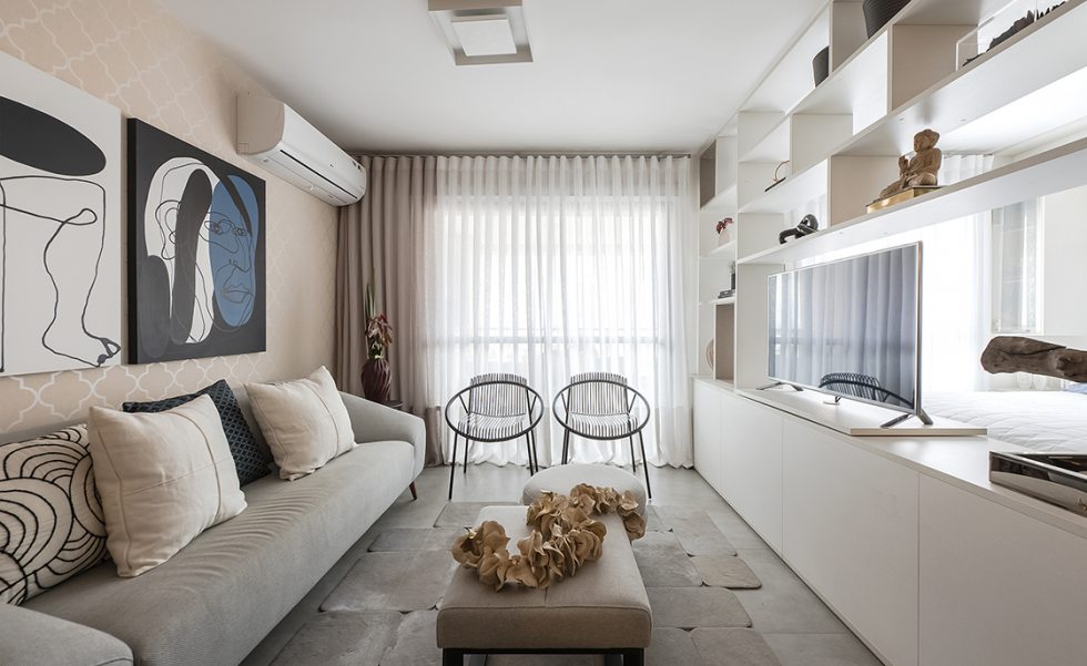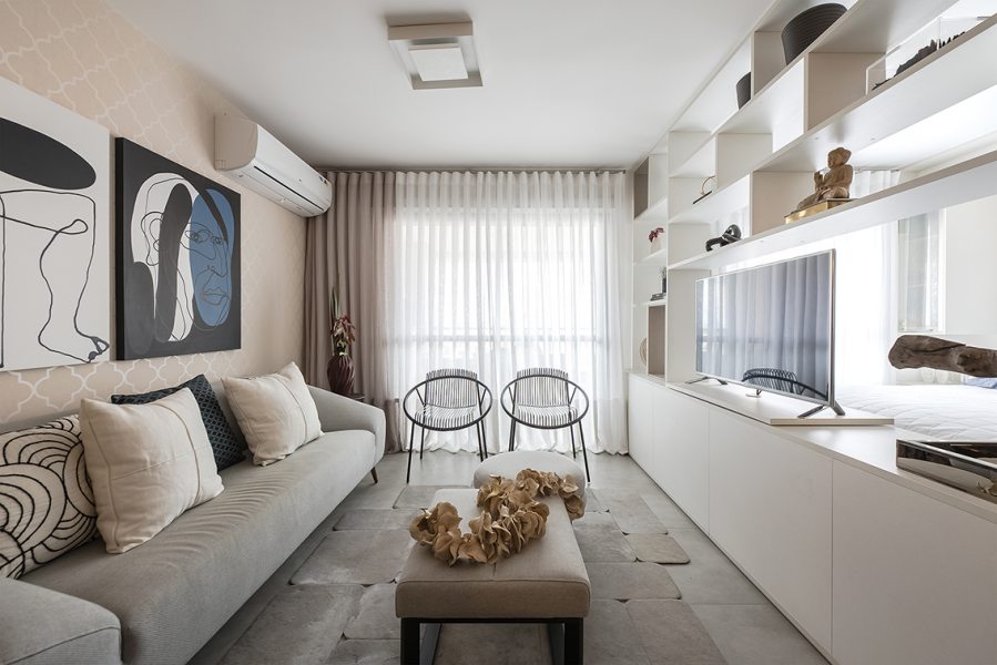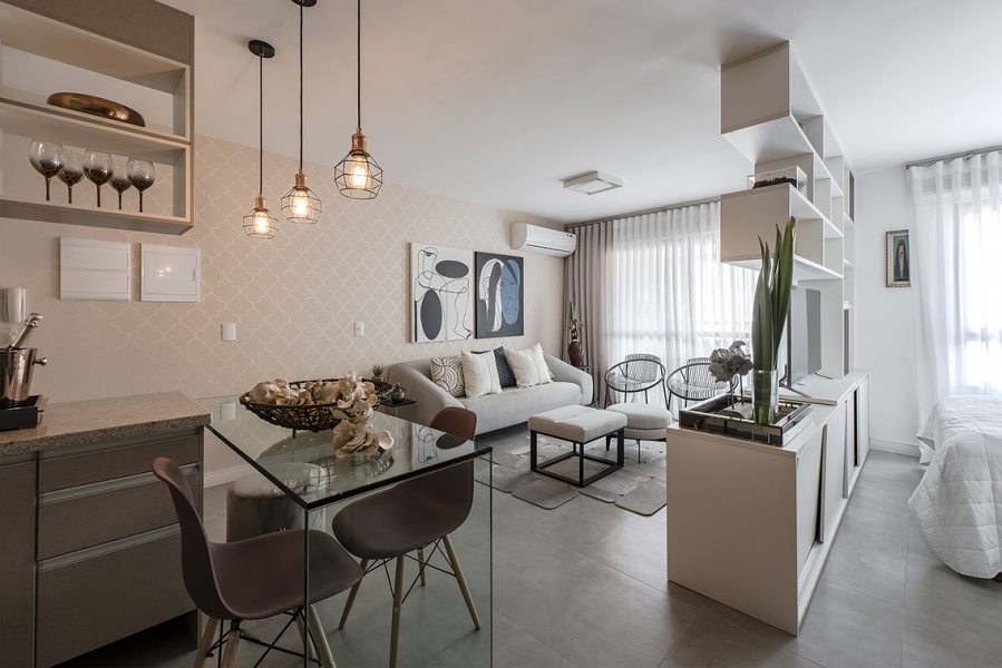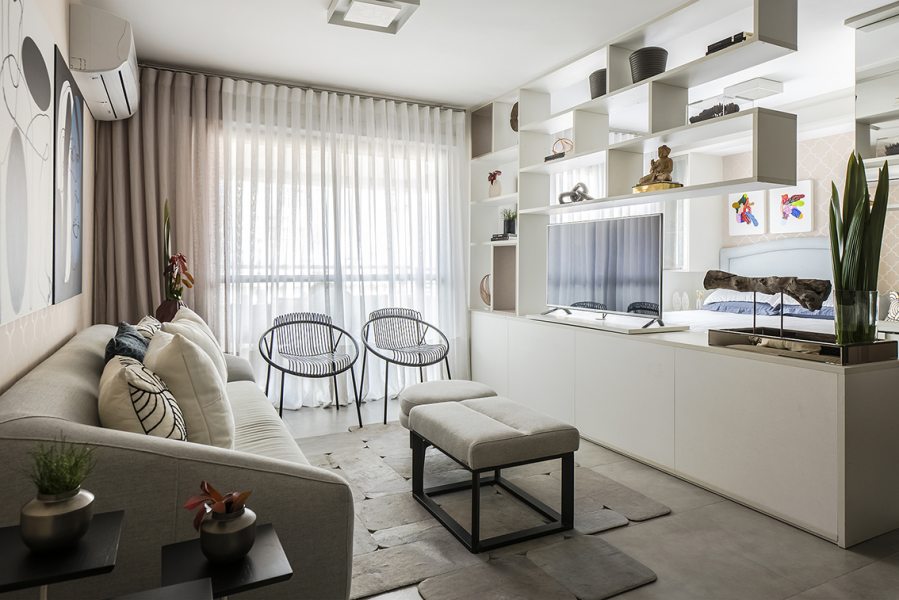 Por se tratar de um apartamento pequeno, a solução encontrada para que houvesse maior aproveitamento das áreas foi criar divisões com o próprio mobiliário, todo da Villa Batel Decor, que trouxe maior dinamismo e fluidez na integração dos espaços. Destaque para a estante com nichos, que além de oferecer armazenamento e funcionar como item decorativo, também serve como uma divisória entre o living e o quarto.
