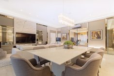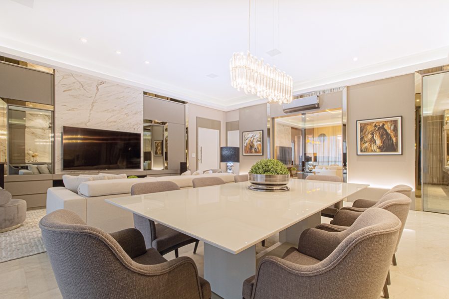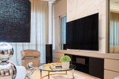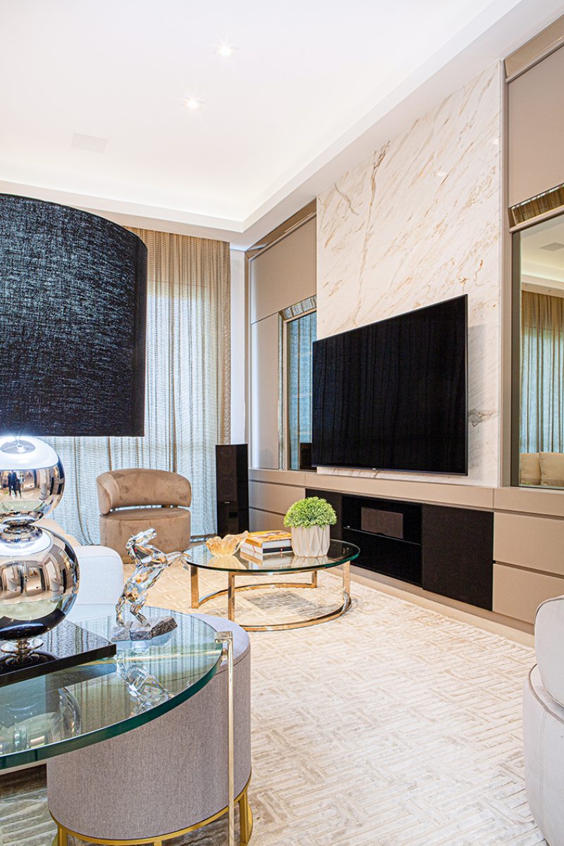 O piso de porcelanato de grande formato e os detalhes em mármore calacata compõem a base neutra do projeto, que contrasta com toques de cor em objetos decorativos. “Os clientes são apaixonados por som e imagem. Por isso, procuramos a Euro Áudio, loja que detém as melhores tecnologias do segmento no mercado curitibano”, elogiam. O sistema completo de caixas de som, televisor e receiver foram todos adquiridos na Euro Áudio e acomodados no móvel personalizado em BP Gianduia High Gloss.