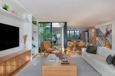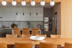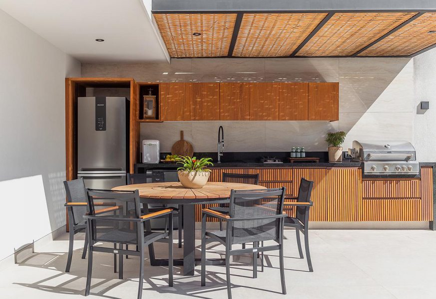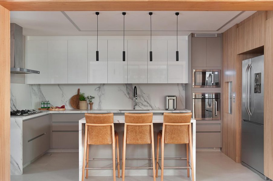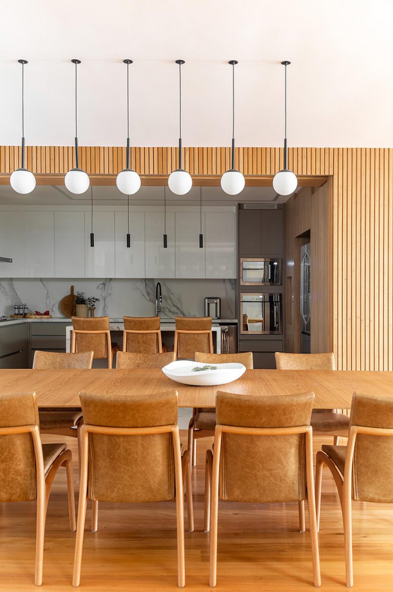 A nova cozinha, com ilha central, ganhou painel de marcenaria ripado que permite 100% de abertura e integração com a área de jantar, mas também seu fechamento no dia a dia.
