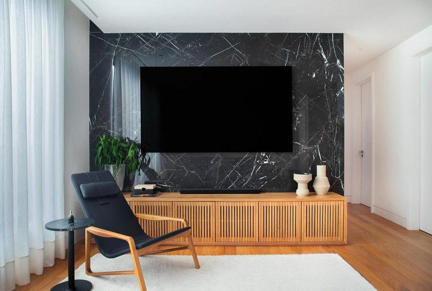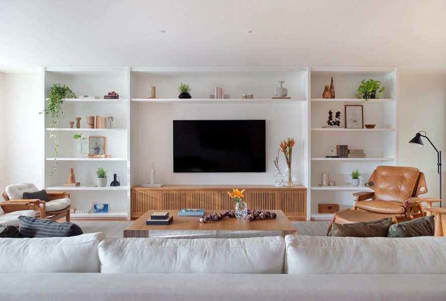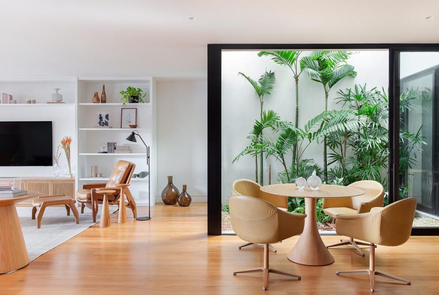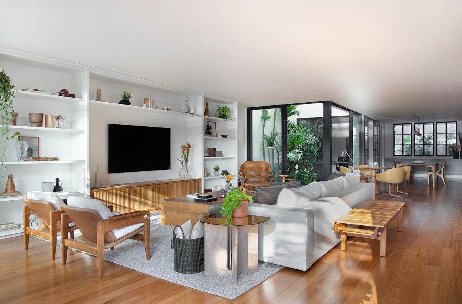 O mobiliário conta com peças de destaque de designers brasileiros como Sergio Rodrigues e Jader Almeida, além de diversas peças de marcenaria personalizadas para a residência.