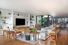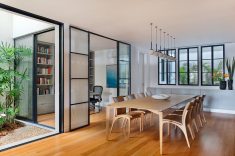 O térreo foi totalmente redesenhado para proporcionar maior integração entre os ambientes de estar, jantar, cozinha e escritório. O resultado foi obtido principalmente pela eliminação de diversas paredes como também de vigas e pilares que não eram responsáveis pelo suporte estrutural.