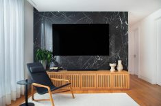 Os espaços do piso superior também ganharam nova formatação. O andar foi destinado à área privativa do apartamento e contém quatro confortáveis suítes e sala de TV. Uma pequena despensa localizada na sala de TV permite maior independência e conforto à família.