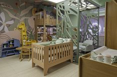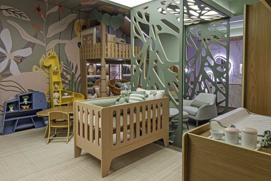 Um ambiente seguro e confortável para o crescimento e desenvolvimento da criança desde o nascimento. A grande caixa vazada, com formas orgânicas é o espaço destinado para amamentação e foi pensado em trazer conforto e aconchego. O banheiro integrado garante praticidade e funcionalidade para os cuidados diários. O ambiente foi concebido para estimular o desenvolvimento infantil e oferecer uma experiência única e encantadora para os pais e seus filhos.