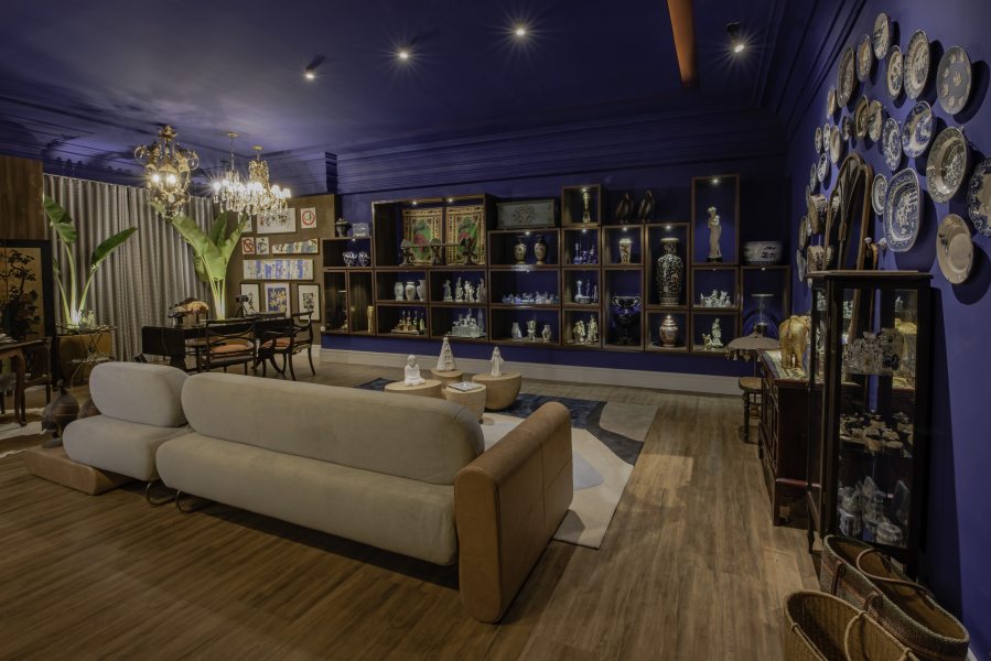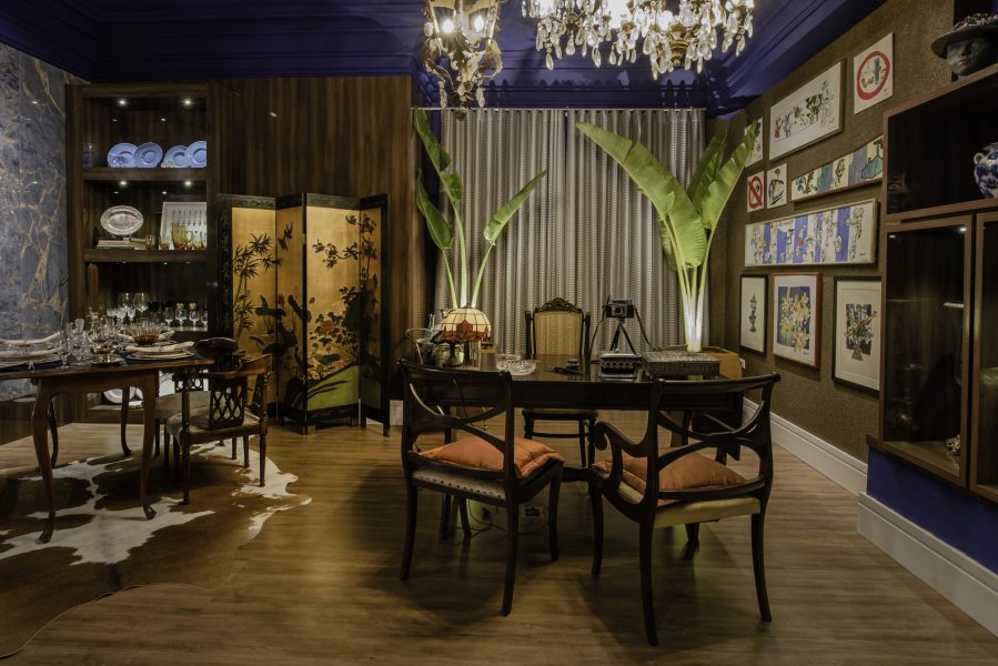 O Estar do Colecionador é uma verdadeira homenagem às peças únicas, exclusivas e históricas de diferentes partes do mundo. Com a inteção de conecta-las, a escolha do azul marinho remete ao oceano que banha os continentes, enquanto os móveis de madeira maciça e a marcenaria sob medida em laca oferecem um espaço perfeito para exibi-las. Destaque para o sofá e o tapete moderno, além do revestimento marmorizado em azul, oferecem um toque sofisticado e elegante. O ambiente valoriza a mistura do clássico com moderno, uma característica marcante dos projetos conceituais dos autores.