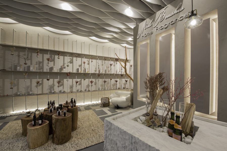 Arquitetura sinestésica. Esse foi o conceito trabalhado na Loja de Aromas, onde levamos em consideração os elementos estéticos e a combinação dos elementos, dos revestimentos e das texturas que conseguem, em conjunto, transformar a experiência do público estimulando os diversos sentidos, desenvolvendo sensações e emoções positivas relacionadas ao espaço. O ambiente remete à praia, ao frescor e ao jardim perfumado.
