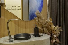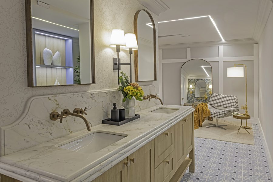 O lavabo da casa traduz o autocuidado consigo e com a casa, a construção de um lar com memória e afetividade. Inspirado no refúgio moderno traz elementos simbólicos e sem excessos que representam o cuidado com o corpo, mente e alma do homem e da mulher e que trazem conforto e aconchego para o novo estilo de morar através da construção de uma casa com identidade.