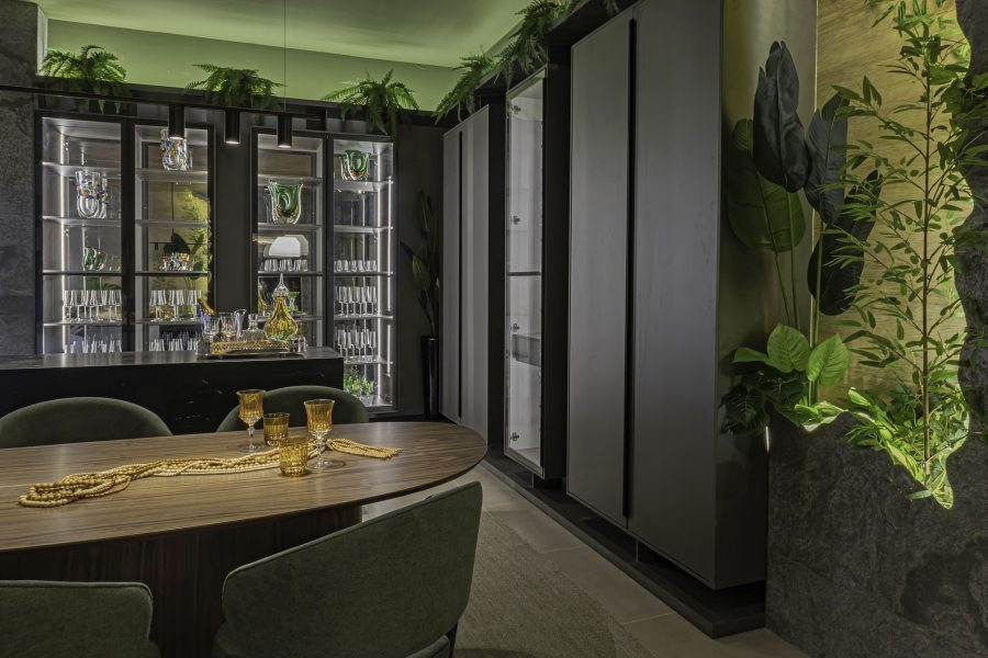 O momento exige total simbiose entre a casa e o seu morador. Não se trata mais de decorar um ambiente e sim de vesti-lo. Memórias afetivas preenchem os espaços Materiais são extensões das preferências e vivências dos moradores. A COPA/CRISTALEIRA tem como centro a comunhão de família e amigos, expressado através de móveis de conceito moderno e formas orgânicas. Nela poderão ser preparados pequenos brunchs. O mobiliário de apoio composto pela cristaleira e adega complementa a atmosfera intimista.
