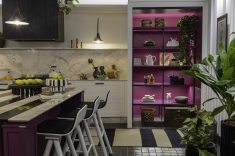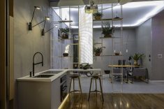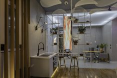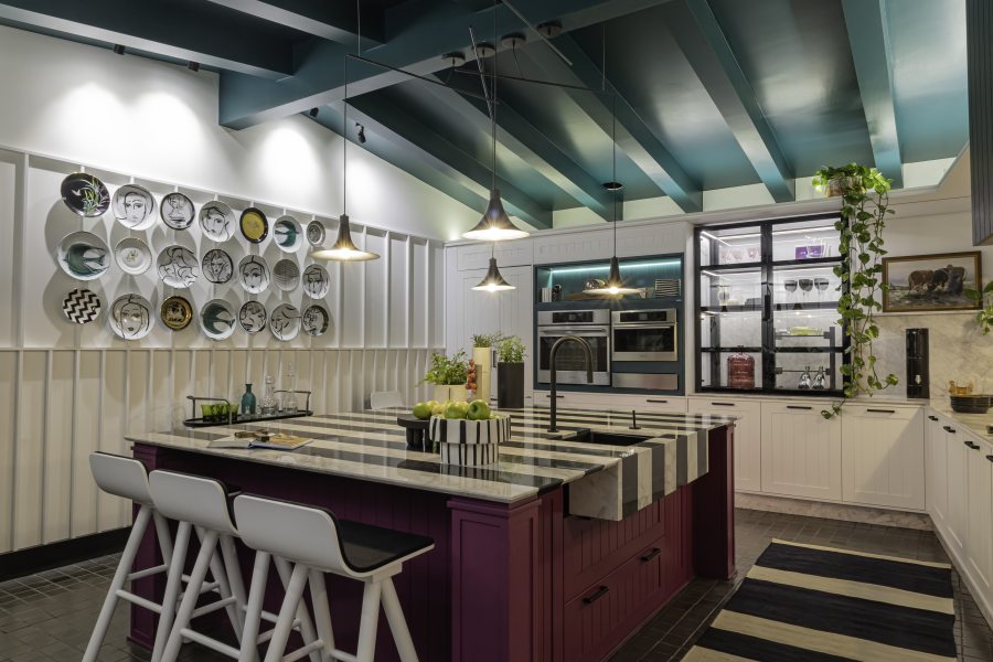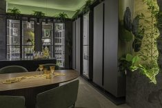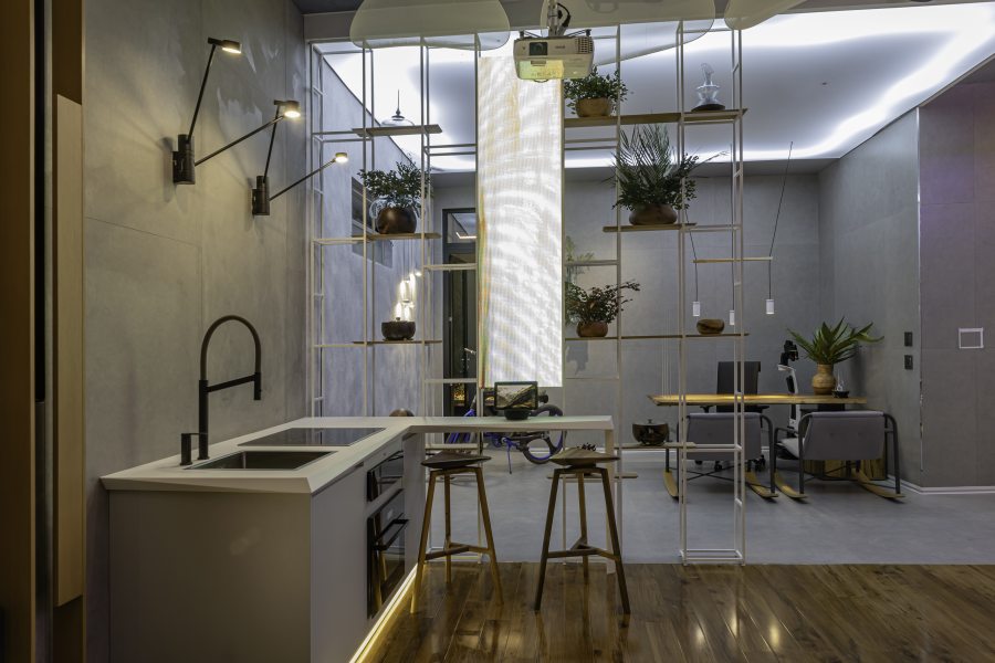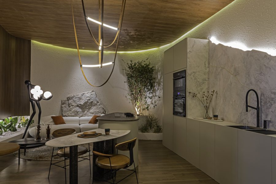 A cozinha é o coração da casa dos brasileiros. O espaço recebe o nome de “Casa Cucina” e conta com um olhar sensível e atual sobre o lar, um projeto de personalidade forte. O grande destaque da cozinha é a ilha central, que apresenta um trabalho específico de marchetaria com o mármore. A ilha auxilia na circulação do espaço, sendo o ponto focal do layout do projeto. O estilo industrial ganha destaque junto a serralheria de todo ambiente.