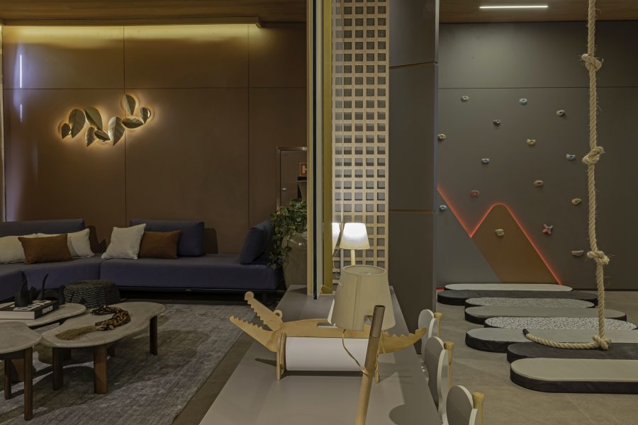 Pensado na interação da criança e a família com o espaço, seja no momento de brincar ou em um momento mais tranquilo, como assistir um desenho na confortável sala ou simplesmente sentar com os pais e ouvir um conto. Foram criados setores diversos entre eles: movimento e acão como as estruturas metálicas tipo “trepa-trepa”, argolas e cordas envolvidos por futom, espaço de leitura com estante na arvore e puffs coloridos, balanços em espaço instagramável na casinha, mesa de atividades, quadro negro e uma gostosa sala para assistir desenhos.