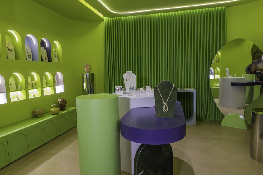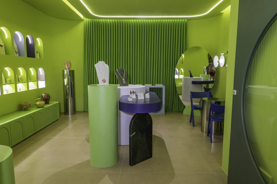 A joalheria Simbiose é um espaço que busca uma conexão profunda entre o corpo, a energia interna e o espaço em que vivemos. Com um design contemporâneo e formas orgânicas, a combinação do verde cítrico e os tons empoeirados dão vida às joias, transformando e valorizando o olhar para si mesmo e para as peças. É uma experiência vibrante e radioativa, que transmite a sensação de novidade e um olhar para o futuro.