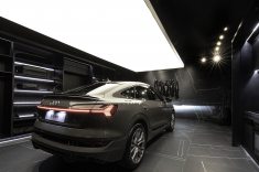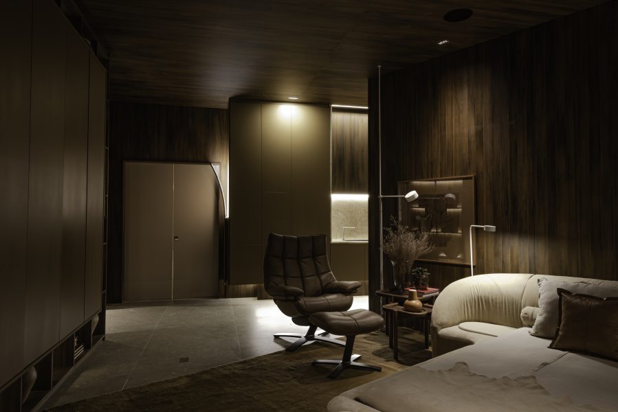 O ambiente faz uma reflexão sobre a garagem contemporânea. Será que, nos dias de hoje, ela deve ser apenas um lugar para guardar o carro? O arquiteto acredita que não, que é preciso pensar que espaços nobres como esses devem ser multifuncionais, serem também locais para o lazer, convívio e permanência. O carro elétrico, no centro do ambiente, é o protagonista e o mobiliário quando fechado, reflete toda a tecnologia do mesmo, mas quando aberto revela e oferece múltiplas possibilidades de usos. O preto é a aposta de cor, com todas as suas possibilidades de texturas e reflexos.