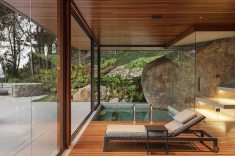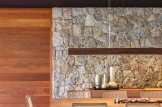A solução foi trabalhar com um volume alongado, paralelo às linhas de contorno, e acomodar os níveis em relação ao terreno. “Muitas pedras foram encontradas – as maiores foram usadas para sustentar a construção, como no caso da garagem e do volume da sauna, onde as pedras ficaram expostas. As pedras menores foram usadas nas paredes e também divididas para servir como revestimento de parede – cada pedra foi bem aproveitada”, revela o arquiteto Maurício Magarão, do escritório Magarão e Linderbeg.