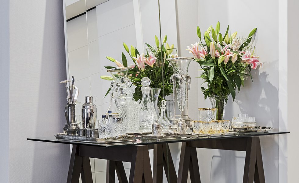 A arquiteta Ester Kloss ensina como arrumar um luxuoso aparador utilizando peças como cristais, garrafas, copos e objetos em bandejas de formatos e tamanhos diferentes.