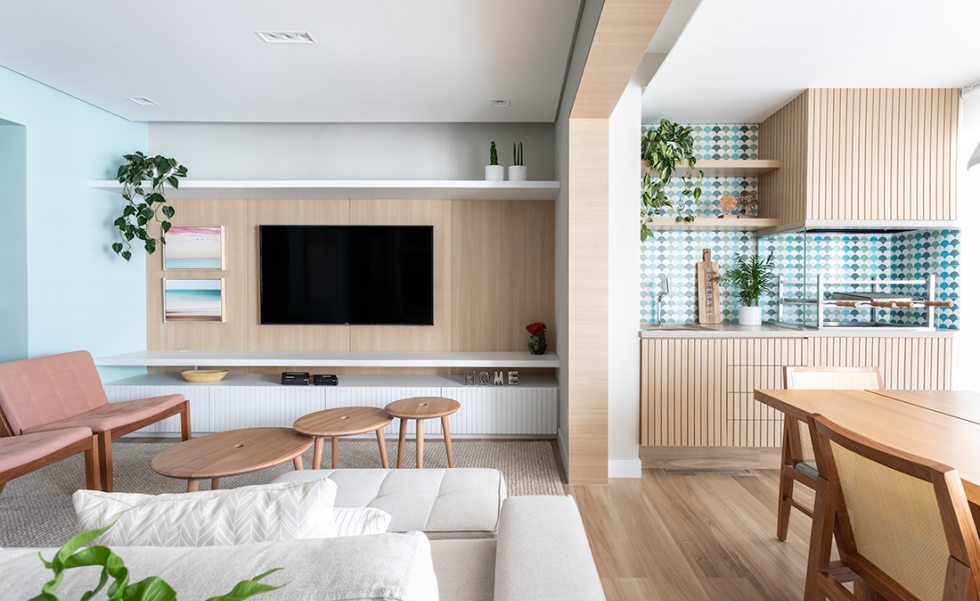 Outra vantagem é que a socialização dentro do lar também aumenta com a adoção do conceito aberto, perfeito para propiciar mais conforto ao receber amigos e familiares. Com a conexão entre sala e cozinha, bastante presente na integração, é possível conversar com quem está preparando a refeição ou com quem está na sala sem precisar sair do lugar, facilitando a interação. “A varanda também se tornou bastante requisitada, pois pode alongar o estar social, fazer as vezes de sala de jantar e até mesmo funcionar como ambiente gourmet”, detalha a arquiteta. A expansão do campo de visão permite um contato mais próximo também entre os moradores, sendo indicada para famílias com crianças ou membros que precisam de supervisão.