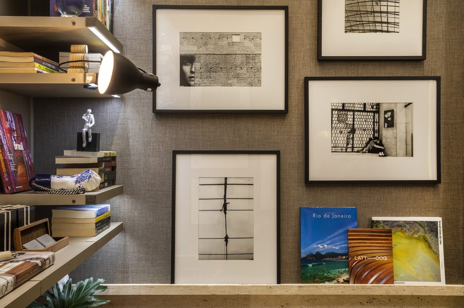 As arquitetas Juliana Terreri e Lucila Jorge criaram um ambiente para relaxar. A estante em laqueado bege domina uma das paredes, preenchida com livros, pinturas, esculturas, vasos e antigos decorativos. Nas outras superfícies, imagens de fotógrafos brasileiros. O linho reveste as paredes, e travertino romano em escama de peixe, o piso. O mobiliário traz materiais naturais como madeira e couro.